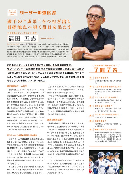 自分の性格は?人生で最も影響を受けた人は?今、ハマっているものは?欠かさない日課は?オススメのリラックス方法は?座右の銘は?職員に向けてメッセージ戸田中央メディックス埼玉を率いて4年目となる福田五志監督。今シーズン、チームは勝利を積み上げ東地区初優勝。次は日本一に向けて勝負に挑もうとしています。そんな強さの立役者である福田監督。リーダーのあり方に影響を与えられたというこれまでの歩み、そして選手を見つめる指導者としての姿勢について伺いました。戸田中央メディックス埼玉監督[ふくだ・いつし]1956年、鹿児島県生まれ。1997~99年、2007~16年にトヨタ自動車女子ソフトボール部レッドテリアーズ監督としてチームを指揮。日本リーグ通算205勝66敗の成績を残す。日本リーグ優勝5回、全日本総合選手権優勝4回を獲得。17年、名誉監督就任。2016年に日本代表監督を務め、世界選手権で準優勝に導く。2021年、台湾代表コーチに招聘。同年2月にトヨタ自動車レッドテリアーズを退団後、戸田中央総合病院メディックス・シニアアドバイザー就任。2022年、JDリーグ発足に伴い監督に就任。現在に至る。とても負けず嫌いでとことんやる性格です。高校時代の監督です。勝つことに執念ある監督でしたので、かなり影響を受けました。食べ物、飲み物いろいろありますが、なかでもワインにハマっています。毎朝、バナナ・イチゴ・ブルーベリーのスムージーを作って飲んでいます。マッサージをして気分転換します。「心想事成」。心に想うことは成就するという意味です。日頃から戸田中央メディックス埼玉の応援ありがとうございます。今シーズンも昨年以上の応援をいただいています。ダイヤモンドシリーズ優勝を目指していますので、応援よろしくお願いします。試行錯誤のチーム作り監督に就任して4年。ようやくイメージに近いチーム作りができています。以前のチームでは名誉監督の立場におり、現場から5年ほど離れていました。そのため就任してすぐは選手の能力を見極める能力も追いつきませんでした。データや映像で分析していましたが、やはり現場に入らないと分からないことだらけ。ですから1年目は選手に任せる場面が多かったですね。最初のシーズンはリーグ最下位で、厳しい評価もありました。しかし2年目から徐々に力のある選手が加入し、戦えるメンバーが揃ってきました。チームの改革ができたのは、助けてくれる人がいたからこそ。選手を私に預けてくれる人がいなければ成り立ちません。サラリーマン経験が裏付ける視点以前のチームでは監督を2度務めました。監督をしていない期間は、サラリーマンとして病院の立ち上げや経営を支援する業務に従事。病院やクリニックの建設プロジェクトに携わり、リーダーを務めていました。プロジェクトは建設会社、電子機器メーカー、商社など社外の方と取り組みました。さまざまな業種の方と関りを持てたのは、今となってはいい経験です。振り返ってみると苦難の時代を乗り越えたからこそ、私自身も成長ができたように感じます。幸いなことに私の周囲には支援をしてくださる方が多いのです。こうして戸田中央メディックス埼玉の監督ができているのも、非常に恵まれていると思います。サラリーマン生活を経て監督に復帰すると、ビジネスとソフトボールに共通する考え方が明白になってきました。どちらも一つの組織・チームであり、仕事のやり方は変わりません。仕事が変わると「覚えなければ」となりがちです。でも仕事の方法論は何をするにせよ同じなのだと知りました。成果と結果の違い監督の使命は、選手たちを導くことです。各々が異なる目標を持っているかもしれませんが、チームが目指すべき地点を見定め、率いていく力が不可欠でしょう。私が思うにスポーツは“成果”を出すのがたいせつ。選手に求められるのは「日頃から成果を出すために考える」姿勢です。成果のために思考し、トライする。そこに楽しさやうれしさを見出してほしい。“結果”に執着するとプレッシャーになるだけです。監督の醍醐味は成果を共有できること。それが指揮官を続ける原動力なのです。JDリーグのレギュラーシーズンを終え、チームは東地区1位の成績を残すことができました。残すはダイヤモンドシリーズ。初の日本一を目指してチーム一丸となって勝負に挑みたいと思います。問1問2問3問4問5問6問7福田五志ItsushiFukudaEnhancedLeadershipBook選手の“成果”をつむぎ出し目標地点へ導く役目を果たす7問7答福田監督に聞きました!