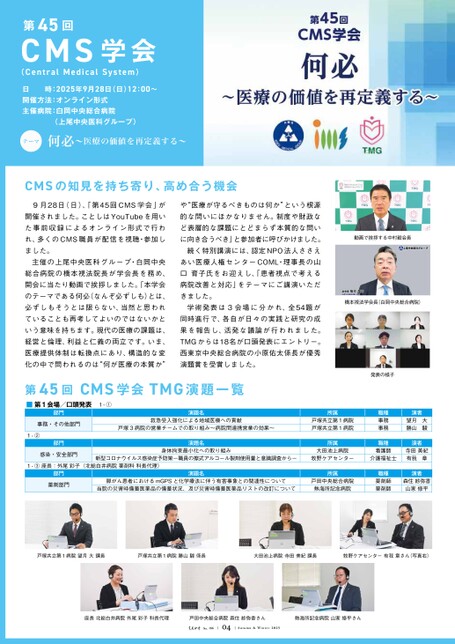 CMS学会(CentralMedicalSystem)第45回何必~医療の価値を再定義する~日時:2025年9月28日(日)12:00~開催方法:オンライン形式主催病院:白岡中央総合病院(上尾中央医科グループ)テーマや“医療が守るべきものは何か”という根源的な問いにほかなりません。制度や財政など表層的な課題にとどまらず本質的な問いに向き合うべき」と参加者に呼びかけました。続く特別講演には、認定NPO法人ささえあい医療人権センターCOML・理事長の山口育子氏をお迎えし、「患者視点で考える病院改善と対応」をテーマにご講演いただきました。学術発表は3会場に分かれ、全54題が同時進行で、各自が日々の実践と研究の成果を報告し、活発な議論が行われました。TMGからは18名が口頭発表にエントリー。西東京中央総合病院の小原佑太係長が優秀演題賞を受賞しました。CMSの知見を持ち寄り、高め合う機会9月28日(日)、「第45回CMS学会」が開催されました。ことしはYouTubeを用いた事前収録によるオンライン形式で行われ、多くのCMS職員が配信を視聴・参加しました。主催の上尾中央医科グループ・白岡中央総合病院の橋本視法院長が学会長を務め、開会に当たり動画で挨拶しました。「本学会のテーマである何必(なんぞ必ずしも)とは、必ずしもそうとは限らない、当然と思われていることも再考してよいのではないかという意味を持ちます。現代の医療の課題は、経営と倫理、利益と仁義の両立です。いま、医療提供体制は転換点にあり、構造的な変化の中で問われるのは“何が医療の本質か”第45回CMS学会TMG演題一覧戸塚共立第1病院望月大課長戸塚共立第1病院勝山駿係長座長北総白井病院外尾彩子科長代理戸田中央総合病院森住紗弥香さん熱海所記念病院山家修平さん大田池上病院寺田美紀課長牧野ケアセンター有我章さん(写真右)動画で挨拶する中村毅会長発表の様子橋本視法学会長(白岡中央総合病院)■第1会場/口頭発表1-①部門演題名所属職種演者事務・その他部門救急受入強化による地域医療への貢献戸塚共立第1病院事務望月大戸塚3病院の営業チームでの取り組み~病院間連携営業の効果~戸塚共立第1病院事務勝山駿1-②部門演題名所属職種演者感染・安全部門身体拘束最小化への取り組み大田池上病院看護師寺田美紀新型コロナウイルス感染症予防策-職員の擦式アルコール製剤使用量と意識調査から-牧野ケアセンター介護福祉士有我章1-③座長:外尾彩子(北総白井病院薬剤科科長代理)部門演題名所属職種演者薬剤部門膵がん患者におけるmGPSと化学療法に伴う有害事象との関連性について戸田中央総合病院薬剤師森住紗弥香当院の災害時備蓄医薬品の備蓄状況、及び災害時備蓄医薬品リストの改訂について熱海所記念病院薬剤師山家修平04