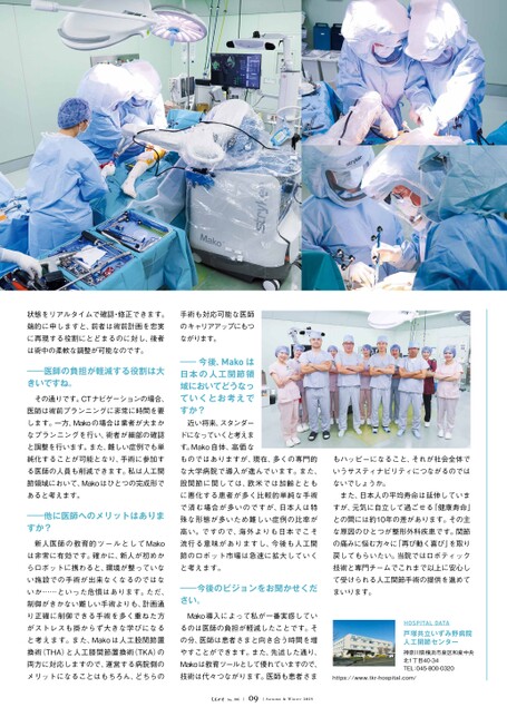 状態をリアルタイムで確認・修正できます。端的に申しますと、前者は術前計画を忠実に再現する役割にとどまるのに対し、後者は術中の柔軟な調整が可能なのです。――医師の負担が軽減する役割は大きいですね。その通りです。CTナビゲーションの場合、医師は術前プランニングに非常に時間を要します。一方、Makoの場合は業者が大まかなプランニングを行い、術者が細部の確認と調整を行います。また、難しい症例でも単純化することが可能となり、手術に参加する医師の人員も削減できます。私は人工関節領域において、Makoはひとつの完成形であると考えます。――他に医師へのメリットはありますか?新人医師の教育的ツールとしてMakoは非常に有効です。確かに、新人が初めからロボットに携わると、環境が整っていない施設での手術が出来なくなるのではないか……といった危惧はあります。ただ、制御がきかない難しい手術よりも、計画通り正確に制御できる手術を多く重ねた方がストレスも掛からず大きな学びになると考えます。また、Makoは人工股関節置換術(THA)と人工膝関節置換術(TKA)の両方に対応しますので、運営する病院側のメリットになることはもちろん、どちらの手術も対応可能な医師のキャリアアップにもつながります。――今後、Makoは日本の人工関節領域においてどうなっていくとお考えですか?近い将来、スタンダードになっていくと考えます。Mako自体、高価なものではありますが、現在、多くの専門的な大学病院で導入が進んでいます。また、股関節に関しては、欧米では加齢とともに悪化する患者が多く比較的単純な手術で済む場合が多いのですが、日本人は特殊な形態が多いため難しい症例の比率が高い。ですので、海外よりも日本でこそ流行る意味がありますし、今後も人工関節のロボット市場は急速に拡大していくと考えます。――今後のビジョンをお聞かせください。Mako導入によって私が一番実感しているのは医師の負担が軽減したことです。その分、医師は患者さまと向き合う時間を増やすことができます。また、先述した通り、Makoは教育ツールとして優れていますので、技術は代々つながります。医師も患者さまもハッピーになること、それが社会全体でいうサスティナビリティにつながるのではないでしょうか。また、日本人の平均寿命は延伸していますが、元気に自立して過ごせる「健康寿命」との間には約10年の差があります。その主な原因のひとつが整形外科疾患です。関節の痛みに悩む方々に「再び動く喜び」を取り戻してもらいたい。当院ではロボティック技術と専門チームでこれまで以上に安心して受けられる人工関節手術の提供を進めてまいります。神奈川県横浜市泉区和泉中央北1丁目40-34TEL:045-800-0320https://www.tkr-hospital.com/HOSPITALDATA戸塚共立いずみ野病院人工関節センター09