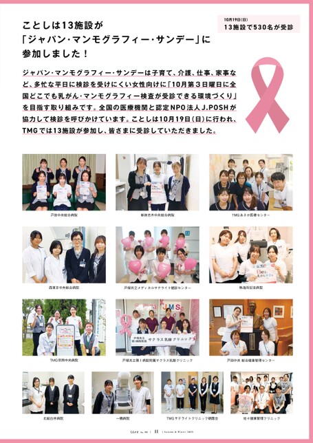 戸塚共立メディカルサテライト健診センター戸塚共立第1病院附属サクラス乳腺クリニック戸田中央総合健康管理センター佐々健康管理クリニック戸田中央総合病院新座志木中央総合病院TMGあさか医療センター西東京中央総合病院北総白井病院熱海所記念病院TMG宗岡中央病院一橋病院TMGサテライトクリニック朝霞台ジャパン・マンモグラフィー・サンデーは子育て、介護、仕事、家事など、多忙な平日に検診を受けにくい女性向けに「10月第3日曜日に全国どこでも乳がん・マンモグラフィー検査が受診できる環境づくり」を目指す取り組みです。全国の医療機関と認定NPO法人J.POSHが協力して検診を呼びかけています。ことしは10月19日(日)に行われ、TMGでは13施設が参加し、皆さまに受診していただきました。13施設で530名が受診ことしは13施設が「ジャパン・マンモグラフィー・サンデー」に参加しました!10月19日(日)11No.1862025Autumn&Winter