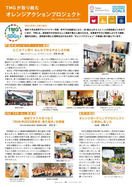 9月20日(土)に上戸田地域交流センター・あいパルで開催された「とこカフェ祭り」は、盛況のうちに終了しました。市内14のオレンジカフェ※が主催した同イベントは、認知症に関する正しい知識を広め、認知症になっても安心して暮らせる地域社会の実現を目指して実施されたものです。当日は、戸田中央総合病院脳神経外科の山崎圭医師による「認知症予防とMCI」の講演をはじめ、各オレンジカフェの活動展示や、認知症の方の見え方を体験できるVR、介護美容、南稜高校茶道部によるお茶席など、楽しみながら認知症について学べる多彩な企画が催され、多くの来場者の方に足をお運びいただきました。また、イベントの趣旨に賛同した多くの地域ボランティアの方々にもご協力いただき、市内の認知症に関わる医療機関、事業所、そして市民の皆さまが連携を深める貴重な機会となりました。9月20日(土)に「RUN伴2025西東京・東久留米」が開催されました。RUN伴とは、今まで認知症の人と接点がなかった地域の住民や企業、商店などが、認知症を生きる本人や家族、医療福祉関係者などと一緒にタスキをつなぎながら走るイベントです。当日は職員もリレーに参加し、ONEFORALL西東京の施設をタスキリレーのポイントと給水地点として皆さまにご活用いただきました。イベントには西東京コース100名、東久留米コース120名、総勢220名の方が参加。皆の思いをタスキでつなぐことで認知症啓発を呼びかけました。今年も認知症予防月間である9月に、所沢市が主催する「ところざわオレンジウィーク」が開催されました。当院では認知症病棟と認知症外来を設けており、認知症啓発シンボルカラーであるオレンジ色の花を全国各地で咲かせる「オレンジガーデニングプロジェクト」に参加しました。当院はオレンジ色のマリーゴールドを種から育てました。育てた花の写真は所沢市役所内に掲示され「認知症になっても暮らしやすいまちづくり」の思いを共有しました。こうした活動を通して、認知症に対する理解が深まり、皆さまの協力が広まることを願っております。SDGs実現への取り組みとこカフェ祭りみんなで作るやさしさの輪地域でタスキをつなぐ「RUN伴2025西東京・東久留米」を開催オレンジガーデニングプロジェクトに参加しました毎年9月は世界アルツハイマー月間。昨今では高齢化により、65歳以上の6人に1人が認知症といわれています。TMGは、認知症の方が自分らしく地域で暮らし続けられる、当事者やそのご家族によりそう病院・施設を目指し、認知症の関心と理解を広げるための“オレンジアクション”の推進に取り組んでいます。オレンジアクションプロジェクトTMGが取り組むTMG×ORANGEACTIONPROJECT私たちTMGは持続可能な開発目標(SDGs)を支援しています戸田中央リハビリテーション病院ONEFORALL西東京東所沢病院地域リハビリテーション・ケアサポートセンター倉林泰士郎TMG本部経営支援部介護事業支援課武田光二総務課花嶋希生※認知症の人やその家族、地域住民、介護や福祉などの専門職が気軽に集い、交流や相談ができる場。レクリエーションをしたり講話を聴いたり、誰もが自由に過ごすことができる。介護ストレスの軽減や地域とのつながりを持つための空間として活用されている。開会式の様子ONEFORALL西東京でタスキをつなぎました参加者で記念撮影マリーゴールドを育てました当日の様子職員も頑張りました!とだ優和の杜による「出張認知症ケア相談室」山崎医師による「認知症予防とMCI」の講演戸田中央リハビリテーションのOTによるコグニサイズ会場の様子16
