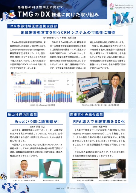 TMGのDX推進に向けた取り組み患者様の利便性向上に向けてCRMシステムの導入により、顧客情報の一元管理や営業活動の可視化が実現し、営業担当者は顧客ニーズに迅速かつ的確に対応できるようになりました。その結果、営業効率が飛躍的に向上し、成約率の増加や顧客満足度の向上にもつながっています。特に、情報共有のスピードアップや営業戦略の最適化が進み、組織全体の営業力強化に寄与しています。今後も、導入施設の拡大やシステムの高度化を進め、地域全体の営業効率向上と顧客サービスの質の向上を目指していく方針です。これらの取り組みは、地域密着型の営業活動を支える重要な基盤となっており、今後の展開に期待が寄せられています。TMG本部地域医療連携支援部は、営業効率の向上を目的としてCRMシステム(CustomerRelationshipManagement:顧客関係管理)を導入しています。現在、東京・神奈川エリアを中心に7つの施設で導入が進んでおり、これらの施設では営業活動のPDCAサイクルを円滑に回すことが可能となっています。これまで、議事録作成にはボイスレコーダーと書き留めたメモを見ながら作成していました。そのため、20分間の会議でも作成に1時間以上がかかり、大きな負担を要していました。今回導入したPLAUDNOTEは、要約・AIアシスタント機能が備わっており、長時間の会議も約10分間で要約が可能。議事録の作成時間も以前に比べ90%削減。負担の軽減に大きく寄与しています。これまで手作業で行っていた日報(月報)作成を、RPA(RoboticProcessAutomation)により自動化しました。入力や集計作業の時間を大幅に削減でき、業務効率が向上しております。また、ロボットが作成してくれることにより、総務課職員全員で対応が可能になりました。今後も他の業務に展開することで、さらなる効率化と職員の負担軽減を目指してまいります。地域密着型営業を担うCRMシステムの可能性に期待あっという間に議事録が!RPA導入で日報業務をDX化CRMシステム「Messiah」の操作画面「効率の良い営業こそが生き残りの鍵」と話す桑原事務長スタイリッシュなPLAUDNOTERPAシステムの操作画面キーボード操作なしで日報が自動作成される薄い!小さい!でも有能TMG本部地域医療連携支援部狭山神経内科病院西東京中央総合病院医事課浅見昌己総務課渡邊卓哉佐々健康管理クリニック事務長桑原圭介18