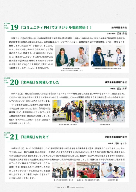 10月11日(土)、あいにくの雨模様でしたが、第46回紅葉祭は500名を超える来場者をお迎えし開催することができました。テーマを「Re:start~繋がる看護・広がる地域~」と掲げ、これまでの歴史を大切にしながらも、新たな形で地域と繋がり、看護を通してさらに広がりのある関係を築いていきたいという思いを形にいたしました。看護サービスや、学びの場となる手作り迷路など、学生達が工夫を凝らした企画は、地域の方々と触れ合い、沢山の笑顔を生み出しました。看護の魅力や学びを共有し、理解を深めていただく機会をご提供できましたならば幸いです。開催に当たり、ご協力いただきましたキッチンカーや工房の方々にも感謝申し上げます。また来年、お会いできますことを楽しみにしております。10月4日(土)、第13回「未来祭」文化祭)を「未来フェスティバル~地域と育む笑顔と思いやり~」をテーマに開催しました。このテーマは、地域の方々に支えられて学んでいることへの感謝と、これから看護師を目指すうえで笑顔と思いやりの心を大切にしていきたいという思いが込められています。1・2年生が協力し、企画から運営・管理まで学生主体で行いました。当日は「手浴」や「妊婦体験」など、看護学校ならではのブースや心肺蘇生法の体験、縁日なども実施しました。幅広い年代の方にご来校いただき、笑顔溢れる未来祭となりました。CLOSEUPTMGCLOSEUPTMG「未来祭」を開催しました「紅葉祭」を終えて2021横浜未来看護専門学校戸田中央看護専門学校AED体験の様子血液となって体を廻る手作り迷路多くの来場者で賑わいました2学年集合写真横川秀男理事長と記念撮影事務課事務長渡辺美琴川原さおり当院では10月6日(月)より、FM熱海湯河原で毎月第1・第3月曜日、13時~13時15分のオリジナル番組「熱海所記念病院の話の図書館」の放送が開始しました。当院の職員がパーソナリティとなり、診療内容の紹介や健康情報、イベント情報などを発信します。病院の“中”で起きていることを、わかりやすく・親しみやすく伝えることで「地域の皆さんに、医療をもっと身近に感じていただく」職員の“人となり”が伝わり、信頼や安心感が深まる」「病院と地域のあたたかなつながりを育む場とする」ことを目的に、「声でつながる医療コミュニケーション」を目指します。CLOSEUPTMG「コミュニティFM」でオリジナル番組開始!!19熱海所記念病院放射線科の今野英玲奈医師が収録に参加初回録音後の金井洋院長とパーソナリティーの市原まこさん企画広報課若林香織25No.1862025Autumn&Winter