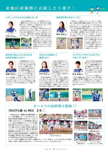 10月27日(月)、朝霞中央公園野球場にてホーム戦“朝霞ラウンド”が行われました。前週に東地区初優勝を決めたチームは、その勢いのままホームでの最終戦に臨みました。試合は1回裏のメディックスの攻撃、NEC投手の立ち上がりを攻め、ツーアウトから3番・山口みどり選手が四球で出塁すると、今シーズンの打点王で頼れる4番・坂本結愛選手が左中間へのツーランホームラン!投げては先発・増田侑希選手―後藤希友選手の継投で無失点に抑える活躍!チームはその初回の2点を守り切り2-0で勝利しました。ホーム戦での連勝を13に伸ばした最強メディックス!今後、チームは11月1日(土)の試合を経て、日本一を懸けた次なるステージ「ダイヤモンドシリーズ」に向かいます。東地区初優勝に貢献した5選手!メディックスとともに成長した一年皆さまに楽しんでいただける試合をお届けします!さらに上を目指して精進したいジャイアンツタウンスタジアムで待っています!達成感を得られたシーズンホームランを放つ坂本結愛選手試合前の円陣手堅いピッチングの後藤希友選手応援にかけつけた朝霞幼稚園の園児たち先発の増田侑希選手が力投ピンクリボン月間はピンク色のユニフォームを着用今田まな選手増田侑希選手後藤希友選手中川彩音選手坂本結愛選手キャプテン今年は戸田中央メディックス埼玉初となるリーグ優勝をすることができました。私は今年で入職4年目です。1年目はリーグ最下位でしたが、そこから3年かけてリーグ優勝できました。今年からキャプテンを務め、不安もありましたが皆さまに支えられながら、個人としても今まででいちばん良い成績を残してシーズンを終えることができました。地元大会では会場まで足を運んでいただいた方も多く、スタンドからの応援に選手全員パワーを貰っていました。私たち選手だけでなく、グループ職員の皆さまも含めたONETEAMで戦えた結果だと、私は感じています。たくさんの応援本当にありがとうございました。今季移籍を経てこのチームに加入させていただきましたが、皆さまの温かい受け入れ、ご理解があり、ここまで来ることが出来ました。東地区初優勝ということで、チームに貢献できたこと、そして1年を通して成長させていただけたことにとても感謝していますし、嬉しく感じています。これからもソフトボールを楽しんで、そして皆さまにも楽しんでいただける試合をお届けします!これからも応援よろしくお願いいたします!今年から戸田中央メディックス埼玉に移籍し、チームにどう貢献していけるのか、すごく不安な気持ちでいっぱいでしたが、こうしてたくさんの方々の支えのおかげで地区優勝をすることができ、とても嬉しい気持ちでいっぱいです。今年は私自身のソフトボール人生で一番苦しさも、楽しさも、悔しさも、色々な感情を感じることができた一年でした。悔しい経験をしたからこそ、私自身を強くしてくれたと思っています。まだまだ上を目指して、精進してまいります。今後とも温かい応援をよろしくお願いいたします。皆さまの応援で東地区優勝をすることができました。しかし、東地区優勝はまだまだ通過点です。日本一へ向けてチーム力を高め、皆さまに最高のプレーをお見せできますよう全力で闘います!チームとしても個人としてもまだ課題は残りますが、一つずつ取り組んで優勝へ向け精一杯頑張ります。これからも戸田中央メディックス埼玉をよろしくお願いいたします。ジャイアンツタウンスタジアムでお待ちしております!!今季のリーグ戦では、チーム一丸となって戦い抜き、念願の東地区優勝を達成することができました。ピッチャーとしてマウンドに立ちながら、試合の流れをつくる責任の重さと、それを乗り越えたときの達成感を強く感じたシーズンでした。個人的には、どんな場面でも落ち着いて投げることを意識し、精神的にも大きく成長できたシーズンだったと思います。そして何より、どんなときも応援してくださったファンの皆さまの存在が、大きな力になりました。これからも感動を届けられるよう、さらに成長し、チームの勝利に貢献できるピッチャーを目指して努力します!引き続き、応援よろしくお願いいたします。得点に沸く選手たちホームでの最終戦も躍動!!10月27日月vsNEC2-0○31No.1862025Autumn&Winter