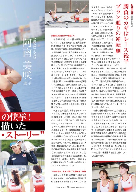 りはなかった。「他のクルーは『レート』という1分間に漕ぐ回数が多いチームでしたが、私たちは回数が少ないかわりに一回の漕ぎで大きく力強く進むことを大切にしていました。序盤は他クルーに出られたとしても1000mを越えてからが勝負というプランでした」と阿南選手は振り返る。その言葉通り徐々に差を詰めていき、1000m地点では1位と0.7秒差まで迫る。勝負どころでは経験豊富な阿南選手がペアをリードする。「阿南選手が“抜けるから行くよ!”と声を掛けてくれたので、私はそれを信じて動くだけでした」と山本選手もそれに応える。1250m地点で並ぶと一気に勝負を仕掛け逆転。その後も他クルーの猛追を振り切り1着でゴール。プラン通りの見事な逆転劇だった。「“一本を強く、大きく漕ぐ”を最後まで意識し続けられたこと」が勝因だと2人は語る。「お互いを信じて自分たちの漕ぎに集中できたと思います」と阿南選手。山本選手は「苦しいレースでしたが2人で声を掛け合いながら耐え続け、狙っていた勝負どころでしっかり仕掛けていけました」と分析した。今後の目標を聞かれると2人は揃って「海外で活躍すること」と答えた。「競技を始めた時から世界で活躍できる選手を目標にしています。その第一歩として日本代表選考で良いパフォーマンスをして、そこから次に繋げていきたいです」と阿南選手。山本選手は「私も日本代表で活躍するのが目標です。最終的には戸田中央総合病院RCの先輩・柿島麗うららさん(2023年シニア日本代表、今年の全日本選手権で引退)のように海外で活躍したいです」と抱負を語った。戸田から始まった“シンデレラガールズ”のストーリーは、近い未来国境を越えて続いていくに違いない。「絶対に私たちが一番速い」今年5月に行われた第103回全日本ローイング選手権大会。山本天そら空選手・阿南美咲選手は「女子ペア」で出場し優勝。同種目では2018年の準優勝がチーム最高成績であり、全日本優勝はチーム史上初めて。さらに、2人は今年入職したばかりでペアを組んでからわずか2ヶ月での優勝という快挙ずくめのタイトル獲得だった。同クラブでは、伝統種目でもある「男子フォア」の四連覇がかかっており、皆の関心は男子フォアのレースに注がれていた(結果:準優勝)。そんな中でも阿南選手には確固たる自信があった。「絶対に私たちが一番速いからね」決勝レース直前、山本選手と言葉を交わした。「ペアを組んだときから“全日本選手権で絶対に優勝できる”と確信した状態でスタート地点に立ちたかった」と阿南選手。大学時代にも全日本選手権での優勝を経験していた阿南選手は、短い準備期間でもブレることなく優勝に向けて突き進んでいた。一方で、山本選手は不安だらけのスタートだった。山本選手が過去経験していたのは2本のオールを使うスカル種目。1本のオールを使って漕ぐスイープ種目の「女子ペア」は全くの未経験。また、2人以上でボートに乗る“クルーボート”もほとんど経験がなかった。「試合の経験もないですし、スイープ種目でのオールの動かし方も理解していない“まっさらな状態”からのスタートでした」と不安が大きかった山本選手。それでも、驚異的なセンスで瞬く間に適応していった。「始めて1ヶ月の時点で私が大学4年間で学んだ半分くらいは出来るようになっていました」と阿南選手はその上達ぶりに舌を巻いた。「私たちが一番速い」のフレーズは、2人の経験と実力が融合し、確かな自信になっていたことの証しだったのだ。“一本を強く、大きく漕ぐ”を最後まで意識決勝レース序盤、中部電力・神戸大学にリードを許し、500m地点を2秒差の3位で通過する展開となったが、2人に焦の快挙!・ストーリー”ATHLETEINTERVIEW描いた勝負のカギはレース後半プラン通りの逆転劇MISAKIANAN選手阿南美咲35