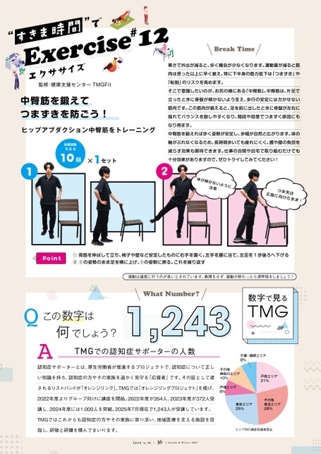 中臀筋を鍛えてつまずきを防ごう!Exercise寒さで外出が減ると、歩く機会が少なくなります。運動量が減ると筋肉は思った以上に早く衰え、特に下半身の筋力低下は「つまずき」や「転倒」のリスクを高めます。そこで意識したいのが、お尻の横にある「中臀筋」。中臀筋は、片足で立ったときに骨盤が傾かないよう支え、歩行の安定には欠かせない筋肉です。この筋肉が衰えると、足を前に出したときに骨盤が左右に揺れてバランスを崩しやすくなり、階段や段差でつまずく原因にもなり得ます。中臀筋を鍛えれば歩く姿勢が安定し、歩幅が自然と広がります。体の軸がぶれなくなるため、長時間歩いても疲れにくく、腰や膝の負担を減らす効果も期待できます。仕事の合間や自宅で取り組むだけでも十分効果がありますので、ぜひトライしてみてください!認知症サポーターとは、厚生労働省が推進するプロジェクトで、認知症について正しい知識を持ち、認知症の方やその家族を温かく見守る「応援者」です。その証として渡されるリストバンドが「オレンジリング」。TMGでは「オレンジリングプロジェクト」を掲げ、2022年度よりグループ向けに講座を開始。2022年度が354人、2023年度が372人受講し、2024年度には1,000人を突破。2025年7月現在で1,243人が受講しています。TMGではこれからも認知症の方やその家族に寄り添い、地域医療を支える施設を目指し、研修と研鑽を積んでまいります。“すきま時間”で#12エクササイズこの数字は1,243QA何数字で見るでしょう?PointTMGでの認知症サポーターの人数運動は適度に行うのが良いとされています。無理をせず、運動が終わったら深呼吸をしましょう!①背筋を伸ばして立ち、椅子や壁など安定したものに右手を置く。左手を腰に当て、左足を1歩後ろへ下げる②①の姿勢のまま足を横に上げ、①の姿勢に戻る。これを繰り返すヒップアブダクション中臀筋をトレーニング監修:健康支援センターTMGFit1×セット目標回数10回左右各体が傾かないように注意つま先は正面に向けたまま!12戸田エリア21%その他埼玉エリア28%東京エリア25%戸塚エリア8%千葉・静岡エリア8%その他神奈川エリア10%エリア別の講座受講者割合36